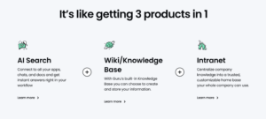 | Guru | AI-powered knowledge management system to align teams with centralized info. | $15/ user/ month | 30-day Free Trial |
