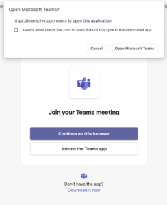- Desktop App: If you already have the Microsoft Teams app installed on your computer, it will automatically open. You can download the app or continue using your browser if you don’t have the app.