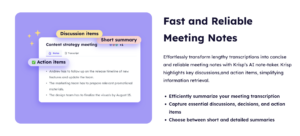 After a long meeting, sifting through notes to identify key takeaways can be tedious. Krisp’s AI meeting assistant steps in to summarize your conversations, highlighting action items and critical points. This not only saves you time but also ensures that you never miss an important follow-up.
