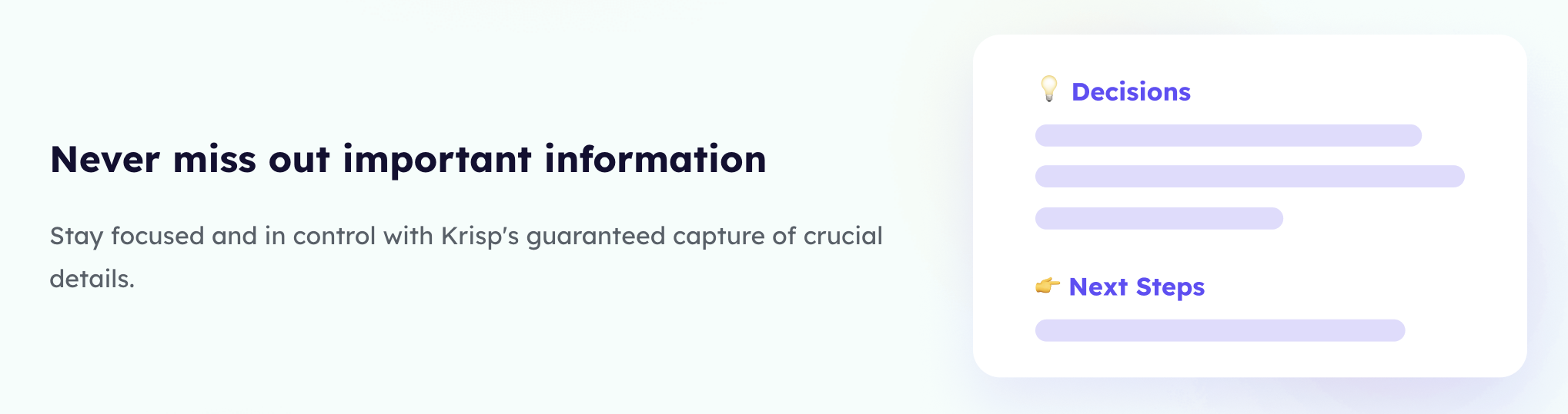 A tool like Krisp can make recording minutes easier and more efficient. With its noise-canceling and transcription features, Krisp can automatically capture the entire conversation without distractions, producing clear, organized meeting minutes. Since Krisp is bot-free, you get accurate notes that reflect the true flow of the meeting, ensuring that every decision and action item is documented properly.