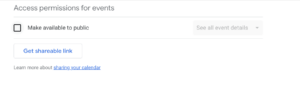 As you repeat the same steps and reach the “Share with specific people or groups” part, you’ll notice an “Access permissions for events” section where you can make your calendar available for the public with a checkmark (image below.)
