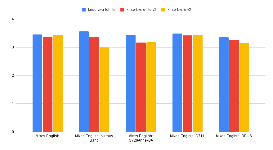 Across all evaluated datasets, it also consistently outperforms its predecessor krisp-bvc-o-lite-v2, showing clear improvements in clarity, noise handling, and overall robustness. Most notably, the new model exhibits significantly stronger performance in narrow-band and codec-degraded conditions—areas that are especially critical for inbound telephony use cases. Even when the input audio is heavily constrained by codec artifacts or low bandwidth, the model maintains stable and reliable output quality, making it well-suited for real-world telephony environments.
