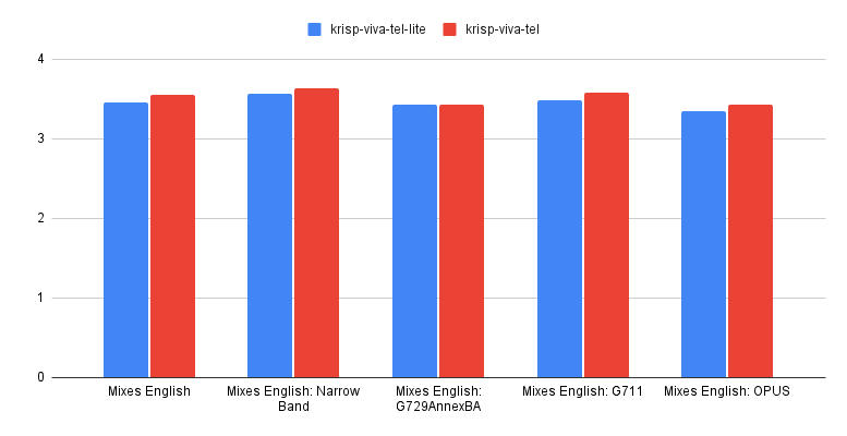 Despite its small size krisp-viva-tel-lite-v1 delivers strong quality, performing at a level remarkably close to ~3.5x larger krisp-viva-tel-v1, industry’s default choice for Voice Isolation model for Voice Bots. The larger model continues to lead in situations involving extreme noise or severely degraded bandwidth, but in most inbound audio scenarios, the new smaller model behaves similarly and produces comparable results. These distinctions are also reflected in the POLQA metrics.